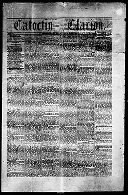 The Catoctin Clarion was a weekly newspaper published in Thurmont, Maryland (formerly Mechanicstown), United States, from March 4, 1871, to 1942. The paper was named for the nearby Catoctin Mountain located west of Mechanicstown. Contents included local, state, national and international news briefs; stories from Frederick County history; market news; poetry and literature in "a rare selection of instructive Reading"; letters to the editor, and advertisements, being called a "sprightly sheet of neat appearance... conducted with ability".[1] The paper measured 18 by 24 inches and ran on Thursdays.[2]