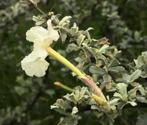 Catophractes alexandri, the only species in the genus Catophractes, is a spiny shrub or small tree up to 3m tall, belonging to the family Bignoniaceae and occurring in the hot, low-rainfall regions of Namibia, the Northern Cape, Kalahari Desert, Botswana, western Zimbabwe and Limpopo. Preferring calcrete, limestone outcrops and soils, the species often forms pure communities, or grows in association with Colophospermum mopane, Rhigozum virgatum, Phaeoptilum spinosum and Acacia nebrownii. It is parasitised by several Tapinanthus spp.[2]