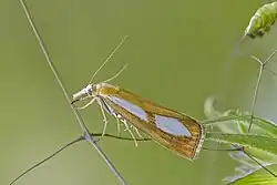 The wingspan is 18–24 mm. The face has a short cone. Forewings ferruginous-ochreous; a shining white broadly dilating median streak from base to 4, cut in middle by a dark brown oblique bar, posterior portion edged with dark brown; second line obscurely brown towards costa; cilia shining brownish. Hindwings are light grey. The larva is dull reddish-grey; spots black, head and plate of 2 black.[1][2]