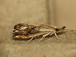 The wingspan is 17–18 mm. The forewings are brown, suffusedly mixed with blackish except on veins and towards costa; anterior half of costa white; an undefined white median streak from base, becoming soon obsolete; second line white, strongly curved and interrupted above middle, indented near dorsum, indentation preceded by an oblique white wedge; cilia rather metallic grey, with three or four slender white bars. Hindwings are light grey.[1][2]