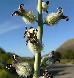 Caulanthus crassicaulis is a species of flowering plant in the family Brassicaceae known by the common name thickstem wild cabbage. It is native to the western United States where it is a member of the flora in sagebrush, woodland, and desert scrub habitats. This is a perennial herb producing a stout, inflated stem from a woody caudex base. The leaves form a basal rosette and occur at intervals along the stem. They are broadly lance-shaped on the lower stem and much smaller and linear in shape higher up. They may have smooth, toothed, or deeply cut edges. The rounded flower has a coat of thick, pouched sepals which part at the flower tip to reveal narrow dark purple or brown petals. There are two varieties of this species: var. crassicaulis generally has hairy flowers, while var. glaber has hairless. The fruit is a long, thin silique which may approach 13 centimeters in length.