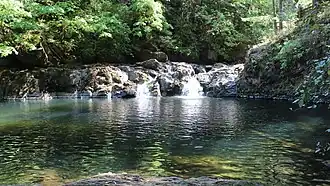 Cavitt Creek Falls Recreation Site is about 3 miles (5 km) upstream of the confluence along Cavitt Creek Road. Managed by the Bureau of Land Management, the forested site features 6-foot (1.8 m) Cavitt Creek waterfall above a swimming hole. Amenities include campsites, water spigots, parking, and restrooms, as well as proximity to fishing spots and hiking trails. The park is open from May 22 to September 26.[5]