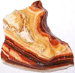 Away from the type area, material now being called "caymanite" is not an "uncommon variety of dolostone" as it is sensu stricto at the type area. It has been reported from the Buda Hills of Hungary.[2] Caymanite occurs as a fine grained or vug filling variety of the mineral dolomite CaMg(CO3)2. It occurs as white to red and black filling in fossil molds, small cavities and caves.[3] It is used as a semi-precious stone. In New South Wales, Australia, pockets of later-deposited beds (usually reddish) are widespread in the Silurian-Devonian limestones. These are thus far reported only from the Lachlan Fold Belt portion of the Tasman Orogenic Zone. They are mostly small pockets but occasionally reach up to several metres wide. These had been long known about and began to be referred to as Caymanite by Dr. Armstrong Osborne who also worked up and published the finding that the Jenolan cave complex is world's oldest known and dated open cave system. The best description so far of the New South Wales caymanite is from Jenolan Caves. None of the NSW material is silicified or in any way suitable for use as a semi-precious stone.
