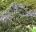 This is an upright shrub with a dense or open form, reaching up to 3 meters in height. The evergreen leaves are about 2 centimeters long and oval shaped, highly ridged and wrinkled and curling under along the edges. They may be gland-dotted and have grayish hairy undersides. The shrub flowers abundantly in inflorescences of small blue flowers. The fruit is a crested spherical capsule about 4 millimeters wide.[4][5]