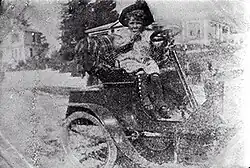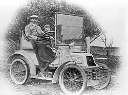 With one of his assistants, Wood drove the car out to Temuka on 13 April 1903, for the fifth annual Temuka Bicycle Club meeting at Victoria Park. Later in the day he drove it on the track and carried the club president, Thomas Gunnion, twice round the circuit.[46] In May 1903, William Ferrier exhibited, in his Stafford Street photographic studio window, a hand water-coloured photograph of "Mr C. W. Wood's cottage, with Mr Wood at the gate in his motor car."[47]