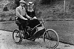 By 10 December 1902, apart from finishing touches and seat upholstery, he had completed and road tested the 3½ hp motor tricycle, and given experimental rides about the streets to several people.[36] Howard and Ruby Tripp of Orari Gorge Station acquired the tiller-steered two-seater motor tricycle in 1903. Their first jaunt in the machine, from Timaru to Orari Gorge at 10 mph, covering 34 miles (54.3 km) with some mishaps along the way, took three days.[37]