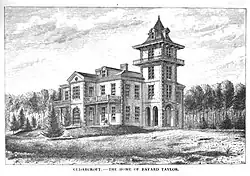 Taylor built the mansion he named Cedarcroft near Kennett Square, Pennsylvania in 1859–1860. He personally supervised its construction, including its two-foot walls and tall tower, and later wrote a series of articles about it. He also owned the surrounding 200 acres of land which he had spent several years acquiring.[3] He described the building's design as "large and stately, simple in its forms, without much ornament... expressive of strength and ornament."[3] He lived here with his wife Marie Hansen, the daughter of the Danish/German astronomer Peter Andreas Hansen, whom he married in 1857.[4] Several of Taylor's writings were either written at Cedarcroft or reference it, including his 1863 book The Poet's Journal, which he dedicated to his wife as "the Mistress of Cedarcroft".[5]
