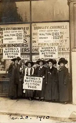 For a period, Wray was an architect in Barnsley where in 1908 she designed some cottages in Cudworth which are still standing.[2] In about 1896, she was a supporter of the Women's Emancipation Union.[3] She was also a prominent activist for women's suffrage being a leading member of the Barnsley Women's Suffrage Society (founded in 1902), of which she was Secretary from 1908 to 1920, when she left the town.[4] She was in a relationship with cancer scientist Alice Laura Embleton (1876–1960).[5] The two of them were photographed with other suffragettes protesting outside the offices of the Barnsley Chronicle in January 1910. In 1911 Wray was living with her father in Barnsley when on the day of the 1911 census Embleton was a visitor. In common with many other suffragettes, the two women defaced the census paper by writing the slogan "Getting votes for those who pay the piper. Getting votes for women" across it.[6]