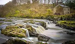 The Cenarth Falls is a cascade of waterfalls just upstream of the road bridge in the village of Cenarth in Ceredigion, bordering Carmarthenshire and Pembrokeshire, Wales. It is notable as the first significant barrier on the River Teifi that salmon and migratory sea trout encounter on their return to their home river as they make their way upstream to spawn. Because of this, and the very attractive setting of the falls in a natural wooded valley, the falls have become a significant visitor attraction in Ceredigion, including in the autumn when the fish can be watched leaping up the falls.[1]