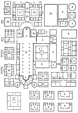 Cenobitic monks were also different from their eremitic predecessors and counterparts in their living arrangements. Whereas eremitic monks (hermits) lived alone in a monastery consisting of merely a hut or cave (cell), cenobitic monks lived together in monasteries comprising one or a complex of several buildings. In the latter case, each dwelling would house about twenty monks, and within the house there were separate rooms or cells that would be inhabited by two or three monks.[8] To early generations of historians, the style of housing maintained by cenobitic monks was attributed to the man usually hailed the "father of cenobitic monasticism," Saint Pachomius, who was believed to have found the idea for such quarters during the time he spent in the Roman army, as the style was "reminiscent of army barracks." While this impression may have been to some extent mythologized by the bishop and historian Palladius of Galatia,[9] communal barracks-like desert dwellings known as cenobia came to exist around the early 4th century.[10]: 28
