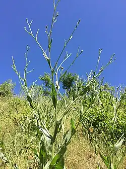 The plant's leaves near ground-level are relatively large, comparable to broad dock or spinach leaves. Rising above those leaves are branching stalks that carry much smaller lightweight leaves and, when in flower, small yellow flowers. Including the upper stalks, the plant is typically a little less than a meter high off the ground. The plant has multiple thick roots. The roots have a brown skin on the outside and a white color internally. The roots come to commerce in a dried form, looking shrivelled, and then are ground to a powder, and used for several traditional herbal medicine purposes. The roots are called Behman Safed, also known as White Behmen, Safaid Behmen, in Ayurvedic Indian medicine.[2]