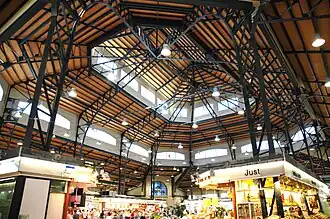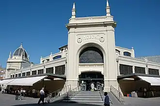 The Central Market of Sabadell (Catalonia, Spain) is a large building designed between 1927 and 1930 by local architect Josep Renom i Costa, spanning both the "monumentalism" typical of the construction craze at the end of Miguel Primo de Rivera's dictatorship and the beginning of the Second Spanish Republic. In 2004 it underwent renovation work.[1] It was devised at the time as a specially fine model for municipal structures of this sort. On the sides is inscribed the Catalan word for "market", mercat. Its floor is an irregular quadrilateral, and its basement included originally an ice factory which, however, was closed at the onset of the Republic because the former government didn't pay for its costs.[2]