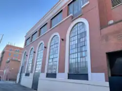 On the south façade are five two-story-high arched windows framed with white terra cotta. A five-foot-tall concrete base runs along the street, with bricks composing the bulk of the façade above that. Three of the five windows end at the base, while two have been extended to street level, having been converted into doors. Between the five arched windows and the cornice are five rectangular windows, one above each of the five arched windows. The rectangular windows are separated by bricks, but their white terra cotta sills are connected. The cornice is also made of white terra cotta below a brick parapet.[6] The south façade faces the publicly accessible Steam Plant Alley.[12]