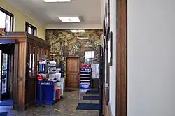 An original mural, Industries of Lewis County, is located on the east wall of the main lobby. The 12 ft × 6 ft (3.7 m × 1.8 m) artwork features scenes of various industries and daily life connected to Centralia during the 1930s, such as agriculture and timber production. The mural was created by Kenneth Callahan, a prominent artist in the state. The artwork was sponsored by the Federal Works Agency Section of Fine Arts, and the Centralia location was one of just 18 post offices in the nation to receive a mural under the program.[3][52] Callahan retouched the mural in 1958, making no changes except repairing the artwork. Years of minor damage done by "thoughtless youths" since it was first installed mostly included scratching of initials.[53]