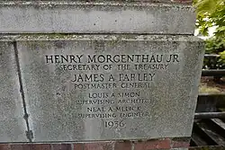 A dedication ceremony was held on October 15, 1937 led by Postmaster General James A. Farley, whose address was broadcast live on radio station KVI.[21] The postponement was due to the accommodation to Farley's schedule. Farley made remarks on Centralia's post office history, defended postal spending deficits and the high cost of federal post office construction projects, discussed communication competition due to the increasing use of the telephone, and spoke of the economic and social benefits that new post offices provided. United States House Representative Martin F. Smith and Senator Homer Bone were speakers and numerous heads of government agencies and local political leaders were in attendance.[22] The construction costs, including furnishings and fixtures, were recorded at $76,377.[17] The Centralia Post Office was the first, and only remaining, federal building constructed in the city as of the 1991 NRHP nomination.[3]