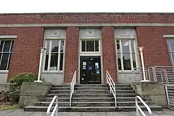The exterior of the building is composed of red brick and is considered flat and symmetrical, and mostly without detail, a common style of Moderne architecture. The main stairway and landing is granite, flanked by sandstone buttresses. Bronze light fixtures, styled as torches, sit atop the buttresses. Railings are aluminum. The NRHP form considers the front of the building to be five separate bays, based on the locations of the entrance and flanking windows. The landing and stairs expand between the middle three bays, which include the front door and two, flanking windows.[3]