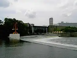 The Century Center Convention Center, designed by architects Philip Johnson and John Burgee, broke construction in 1974 and opened in 1977, has been managed by SMG since July, 2013. The center, built on the banks of the West Race canal, overlooks the St. Joseph River in downtown South Bend, Indiana, United States. It features over 75,000 sq ft (7,000 m2). of convention space and is home to Island Park, an 11-acre (45,000 m2) riverfront park attached to the convention center via a cross walk over the West Race canal.