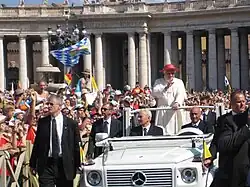 The official tailor of the Pope, Gammarelli, has provided vestments for nearly every pope of the nineteenth and twentieth centuries.[2][3] While Pope Benedict XVI did wear Gammarelli for his first appearance in papal white, there was some difficulty in fitting him in one of the tailor's vestments before he appeared following his election, a delay Lorenzo Gammarelli attributed to the final fittings being done by a novice tailor.[4] He went on to appear on the loggia balcony of St. Peter's with the black sleeves of his sweater visible under the cassock.[5] Benedict then sparked mild controversy by sharing his orders with another clerical clothier, Euroclero.[6] This was attributed in part to the fact that Euroclero's Rome storefront was across the street from his former office as head of the Dicastery for the Doctrine of the Faith.[7][5] Neither Gamarelli nor Raniero Mancinelli, another tailor used by Benedict, would comment as to the identity of the manufacturer of the camauro worn by Benedict in 2005.[8]