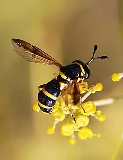Cerioidini is a widespread tribe of around 222 species of hoverfly.[1] Cerioidini are mistaken for wasps for which they are effective mimic. Cerioidini have antennae with a terminal style and have somewhat elongate and basally constricted abdomens, only slightly in Ceriana, but pronounced in most Sphiximorpha; and Polybiomyia, and extremely in Monoceromyia.[2] Larvae live mostly within tree sap associated with tree wounds or putrefying pockets of water in tree cavities.[3]