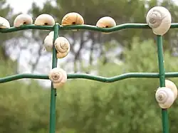 | Cernuella virgata aestivating on a fence in Provence. | |