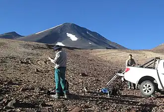 Cerro Vicuñas is a volcanic mountain in the Andes of Chile which lies immediately north of Ojos del Salado. It has a height of 6067 metres.[5] Vicuñas if often used as acclimatisation peak before major peaks like Ojos del Salado. Its slopes are within the administrative boundaries of the Chilean commune of Copiapo.[6]