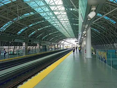 Cerro Viento is a Panama Metro station on Line 2. It was opened on 25 April 2019 as part of the inaugural section of Line 2 between San Miguelito and Nuevo Tocumen.[1] This is an elevated station[2] built above Avenida Domingo Díaz. The station is located between Brisas del Golf and San Antonio.[1] This station provides access to Centro Comercial Los Pueblos with an exit, and to Metromall with a footbridge.