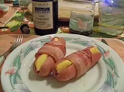 In Alsatian cuisine, cervelas d'Alsace are split open and served with cheese (gruyère) and bacon.[14]