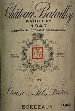 Brothers François and Marcel Borie purchased the estate in 1932, and in 1942 divided it into the two properties that are today Batailley and Haut-Batailley, in order to prevent future difficulties with inheritance laws.[2] The larger part, which included the château, became the sole property of Marcel Borie until his death in 1961, when it passed to his daughter Denise and her husband Emile Castéja.