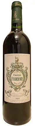 Château Ferrière is a winery in the Margaux appellation of the Bordeaux region of France. The wine produced here was classified as one of fourteen Troisièmes Crus (Third Growths) in the historic Bordeaux Wine Official Classification of 1855.[1] The Château has 29 acres (12 ha) planted with Cabernet Sauvignon, Merlot and Cabernet Franc.[2]