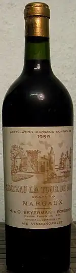A bottle of the 1959 vintage. The label depicts the estate château as it was before it burned down in 1895.[1]