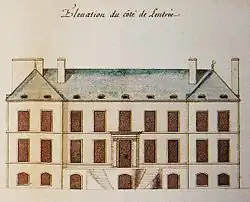 Completed in 1726, it was built in the classical style of the French Hôtel Particulier by King Louis XV's chief engineer in New France, Gaspard-Joseph Chaussegros de Léry. The central building was flanked by two wings with two sets of semi-circular stairs leading up to a terrace and the main entrance. It stood beyond the end of Rue Saint-Paul, which was kept clear of buildings on that side to afford it a clear view, while formal gardens led up to Notre-Dame Street.[2]