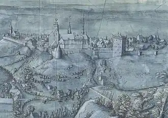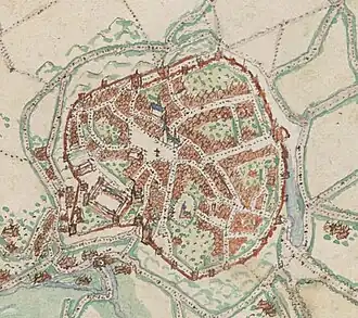 In 1655, French Troops under Turenne invaded the Netherlands.[2] The city of Beaumont refused to cooperate, and in retaliation, the French troops set the city on fire.[2] Barely thirty houses were spared. Also, the castle, the church, and the Salamander Tower were in ruins.[2] Of three kilometres of ramparts, only a third remains. Out of four gates, only one postern remains.[2]