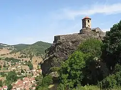 The Château de Saint-Ilpize is a ruined castle in the commune of Saint-Ilpize in the Haute-Loire département of France. The medieval town of Saint-Ilpize clings to a basalt rock on which stands the castle. Within the castle's walls is a 14th-century chapel built of polychromatic tufa; a basalt gable wall houses the church bells.[1]