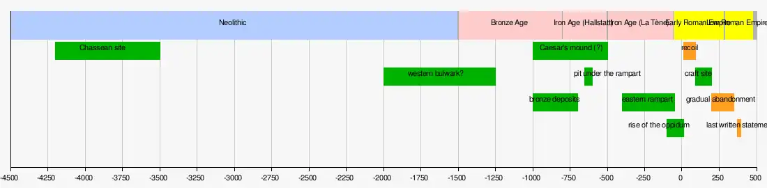 The oppidum was visited during the Paleolithic and Mesolithic periods, as evidenced by the presence of Acheulean and Mousterian hand axes[18] and locally crafted stone tools, respectively. However, there is no evidence of permanent settlements. The site was permanently occupied during the Neolithic period, with a population establishing itself in the western part of the oppidum at Châteliers.[Z 1] The initial rampart, constructed of earth and surrounded by a ditch that gradually filled between the late 1st century BC and the 2nd century AD, may have been erected during this period or slightly later in the Bronze Age.[L3 3] Nevertheless, the rampart has not been subjected to archaeological excavation or radiocarbon dating.[19] It encloses an 8-hectare camp where most pre-Iron Age artifacts have been discovered, with only a few polished axe fragments found outside the camp, to the southeast of the César mound.[L 3]