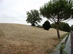 The artificial nature of the earth comprising the mound—which differs from that naturally present in the surroundings—is evident.[15][23] Its dimensions (6 m high by 65-70 m in diameter) and the morphology of the César mound suggest, in comparison to similar structures, that it might be a burial mound for a high-ranking figure, dating to the Bronze Age or Hallstatt, roughly 2000 to 500 BCE.[L 4] In the nineteenth century, alternative hypotheses were put forth suggesting that the mound was constructed as a feudal motte, an idea that persisted into the late 1970s.[24] Another hypothesis posited that the mound was a warren or a foundation for a Chappe telegraph pole, a latter reuse considered possible at the end of the nineteenth century.[25] These explanations are not credible.[26] During the 18th century, the mound was adapted to serve as a watchtower and surveillance post,[Z 5] a role it resumed during World War II.[L15 1] Recently, the mound was partially excavated at its southeast side to allow for an expansion of a vineyard plot.[27]