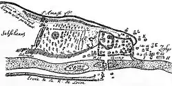An ancient east-west route connecting Cenabum (Orléans) to Caesarodunum (Tours) and following the right bank of the Loire passes through Amboise. It is referenced in the Peutinger Table,[Z 10] although the precise route remains uncertain.[Z 11] A parallel path runs along the left bank;[69] it may traverse the area south of the oppidum[31] along a ridge path situated farther to the east.[70] This route intersects with another south-north route from Port-de-Piles to Amboise, though the precise course of this latter route is uncertain in the vicinity of the latter city.[71][72] The Malvau valley, which borders the oppidum to the east and is extended by the ditch bordering the La Tène-period rampart, may have constituted a natural access route to the plateau from the Loire valley, as no structures connecting the plateau with the valley have yet been identified through research.[L 38]