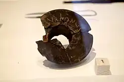 The base of an early 1st-century terracotta vase bears the inscription "VRBANUVS", which may be the owner's cognomen and represents one of the earliest known Latin inscriptions at the site.[L 36]