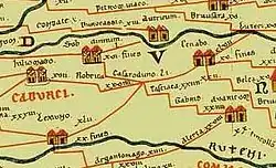 - ^ Since the nineteenth century, the existence of a Turonian capital has been postulated, inferred (sometimes erroneously) from available sources to provide Touraine with a prestigious past. Scholars have located this city, which they have designated Caladunum, near Tours on the right bank of the Loire.[L3 1]