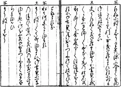 The work was published in 10 fascicles in 1676, when it was adopted as the official textbook for teaching Japanese, replacing 14 out-dated titles.[4] The Japanese text is written in large hiragana, with a phonetic transcription in Hangul on the right and followed by a translation in Korean mixed script.[4] A copy of this edition is held by the Seoul National University Library.[5] The book and its revisions remained the sole official Japanese text for the following two centuries.[4]