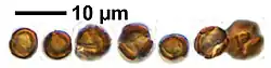 The spores of this organism are distinct in their shape and coloration. The ascospores of this fungus are globose, or spherical and have a distinct yellow-brown coloration. Another notable characteristic of these spores is that they are fissured in their structure. Under a microscope this appears as defined creases in the spore. However, this fissured feature is mainly observed in mature spores. These spores tend to be 7 to 8 micrometers in diameter as well.[2]