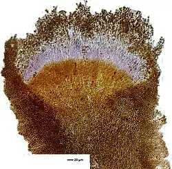 The distinct convex apothecium contains groups of asci bundled together alongside sterile hyphae that grow from the center of the stalk. These asci tend to be cylindrical in shape and contain 8 ascospores each. Additionally, the arrangement of these ascospores can be either in 1 or 2 rows, still coming to a total of 8 ascospores per asci.[2]