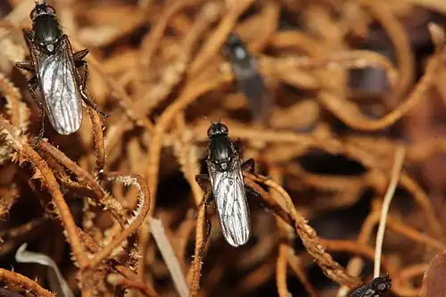 Studies of the mating behaviour of C. littoralis have shown that in common with other Coelopids, larger males have greater mating success, because they are more able to overcome the common resistance behaviours of the female.[12][13] Adult flies mate within the wrack beds, and females lay their eggs onto the wrack. Their larvae feed on the decaying algae and its associated microorganisms,[11] and go through three developmental stages (or instar) before pupating on sand further up the beach.[3]