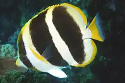 - ^ Myers, R.F.; Pratchett, M. (2010). "Chaetodon tricinctus". IUCN Red List of Threatened Species. 2010: e.T165687A6091795. doi:10.2305/IUCN.UK.2010-4.RLTS.T165687A6091795.en. Retrieved 20 November 2021.