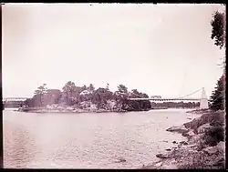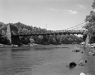It was replaced in 1810 by a wrought-iron chain suspension bridge.[6] James Finley, a Pennsylvania engineer, patented the chain construction in 1808. Using his designs, he built a bridge, since destroyed, over the Schuylkill River that year.[3] This bridge operated as a toll bridge until 1868, when it was purchased by Essex County and opened to public access without charge.[3] Scientific American reported in 1896 that it was "the solitary specimen in New England of a style of suspension bridge that has served its intentions admirably, and may still be found preferable to the wire bridges under certain circumstances".[3][a]