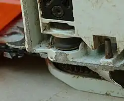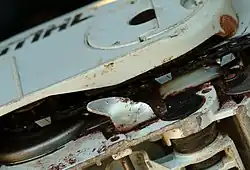 The chain catcher helps prevent the chain being thrown back towards the user, if the chain breaks or becomes derailed.[1][3] The catcher catches the chain when it derails downwards and shortens it. Then the chain moves underneath the saw body smashing against the rear hand protection at the rear handle (The bottom of the handle is wider to the back side as to the other). As shown in the image, chain catchers are made of aluminum so as to not damage the chain. A worn out chain catcher can be changed.