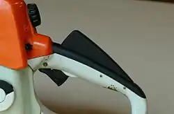 The engine throttle is operated by the trigger under the rear handle of the saw. Unless the lock-out switch above the rear handle is also pressed, the throttle cannot move from the idle position, and the chain will not be driven.[1]