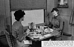 Lounge cars were designed for single, double, and table seating. Porter service was available throughout the train, and most stations had agents on duty to assist passengers. Rare in the railroad industry, two coaches at the head of the train carried only women, one of these tailored for women with children. A registered nurse-stewardess was carried, another first. The women received $125 per month plus expenses ($2,832 in 2024).[1]