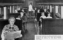 The Challengers were named passenger trains on the Union Pacific Railroad and the Chicago and North Western Railway (which was replaced in 1955 by the Milwaukee Road). The economy service ran between Chicago, Illinois, and the West Coast of the United States. The trains had full Pullman service and coach seating and were an attempt to draw Depression-Era riders back to the rails. Food service was advertised as "three meals for under a dollar a day."[1]