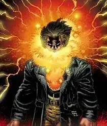 Jono's thoracic and abdominal cavities are a chamber for a furnace of psionic energy capable of nuclear fission whose output can be projected as wide blasts of concussive force or laser-like focused beams that disrupt atomic bonds.[20] The initial manifestation of said powers destroyed most of his internal organs along with his mouth and chest.[30][31][32] Chamber requires no food or oxygen and is seemingly indestructible, as he has disintegrated his own body along with D'Spayre's down to their sub-atomic components in a kamikaze attack and later reconstituted himself.[33][34]