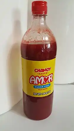 Chamoy (Spanish pronunciation: [tʃaˈmoj]) is a variety of savory sauces and condiments in Mexican cuisine made from pickled fruit. Chamoy may range from a liquid to a paste consistency, and typically its flavor is salty, sweet, sour, and spiced with chilies.
